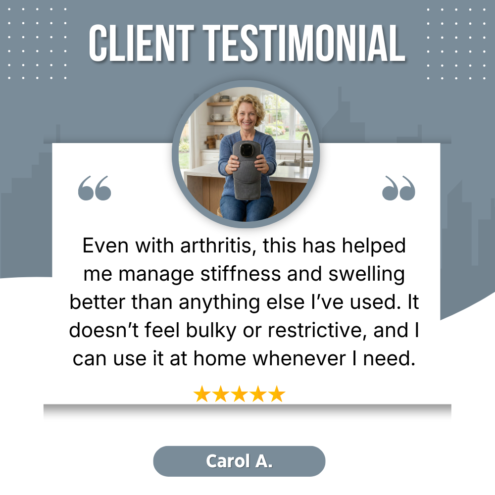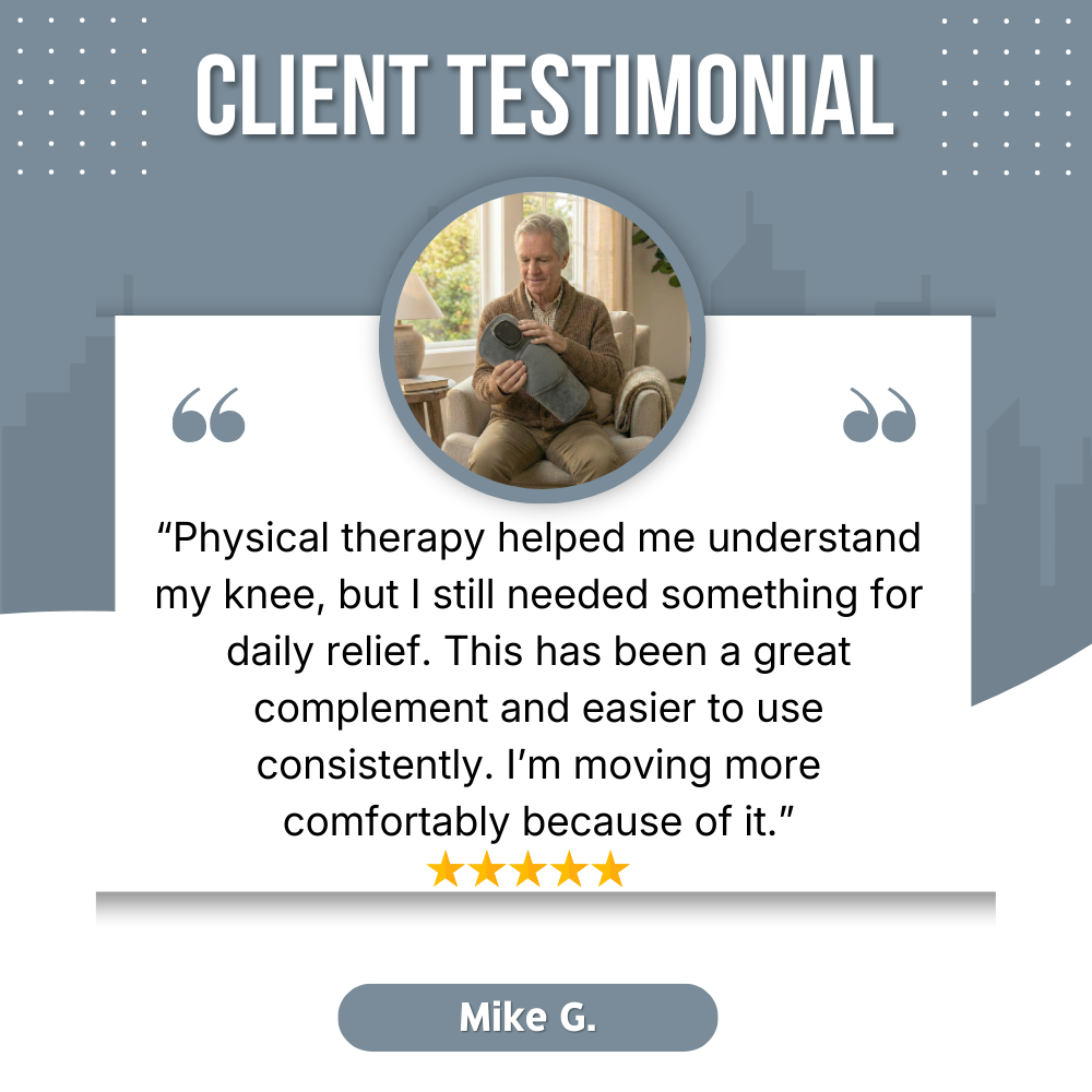 Yes. RecoverPro was designed for adults dealing with knee pain, stiffness, or swelling not high-intensity training. It’s gentle, non-invasive, and commonly used by people managing arthritis, overuse, or post-injury discomfort. You control the settings and can start at the lowest level for comfort. If you can walk and move your knee, you can use RecoverPro safely at home.